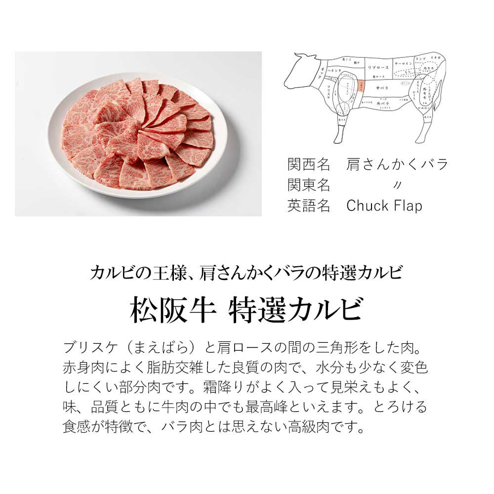 松阪牛の特選カルビは、カルビの王様と称される肩さんかくバラを使用した逸品です。赤身と脂肪が絶妙に交差し、霜降りが美しく、見た目も味も最高峰の牛肉です。とろけるような食感と豊かな風味が特徴で、贅沢なひとときを演出します。印籠木箱に入っており、特別なギフトやお祝いに最適です。大切な方への贈り物として、心に残る一品をお届けします。