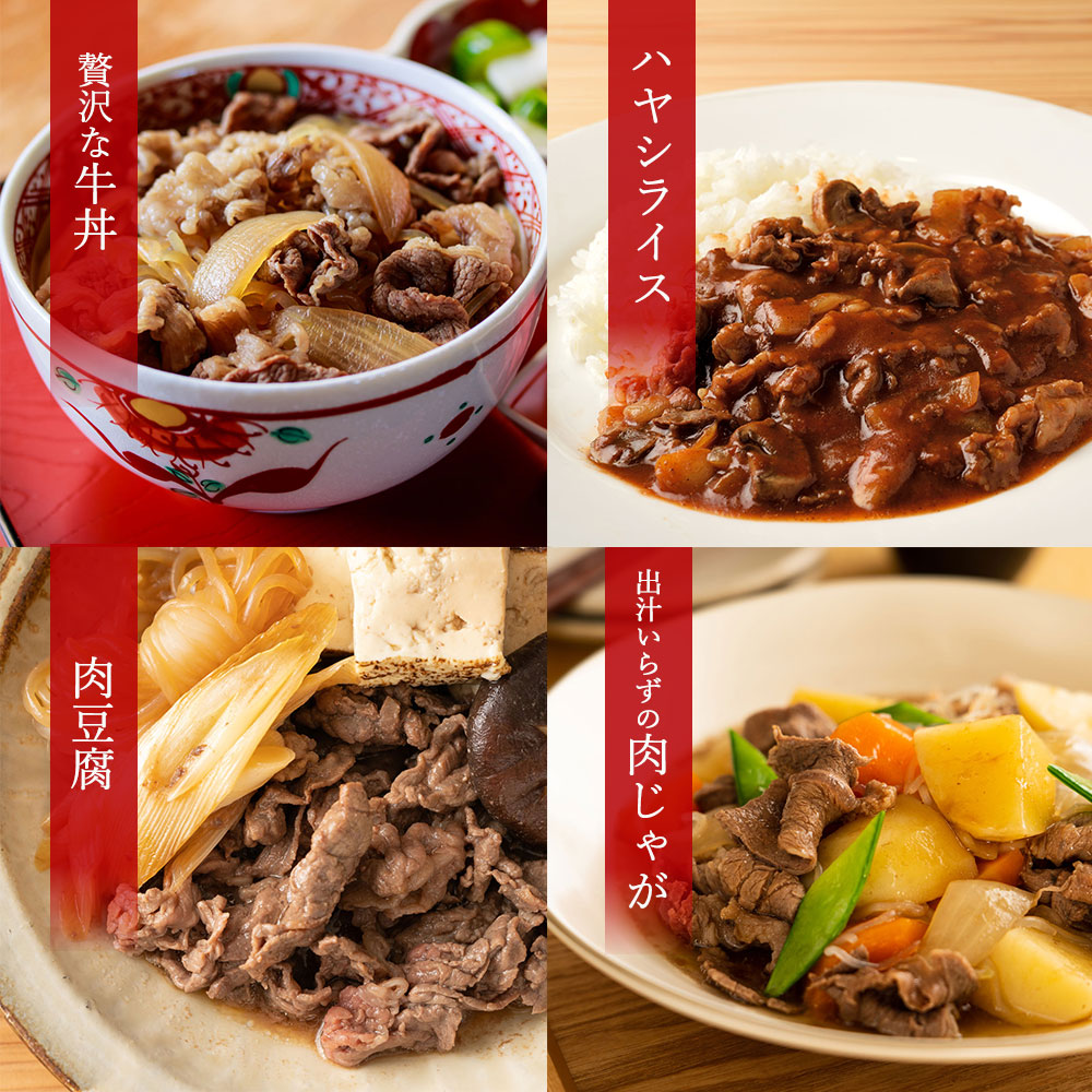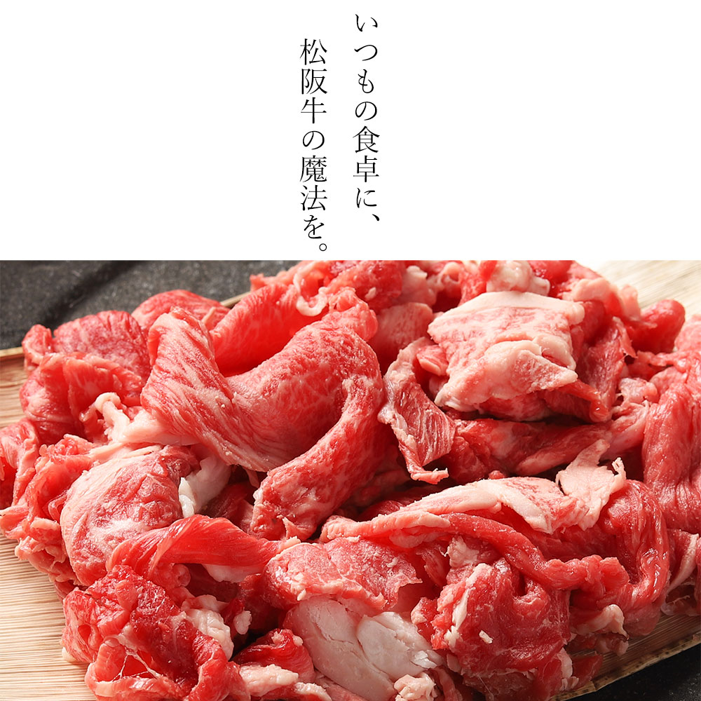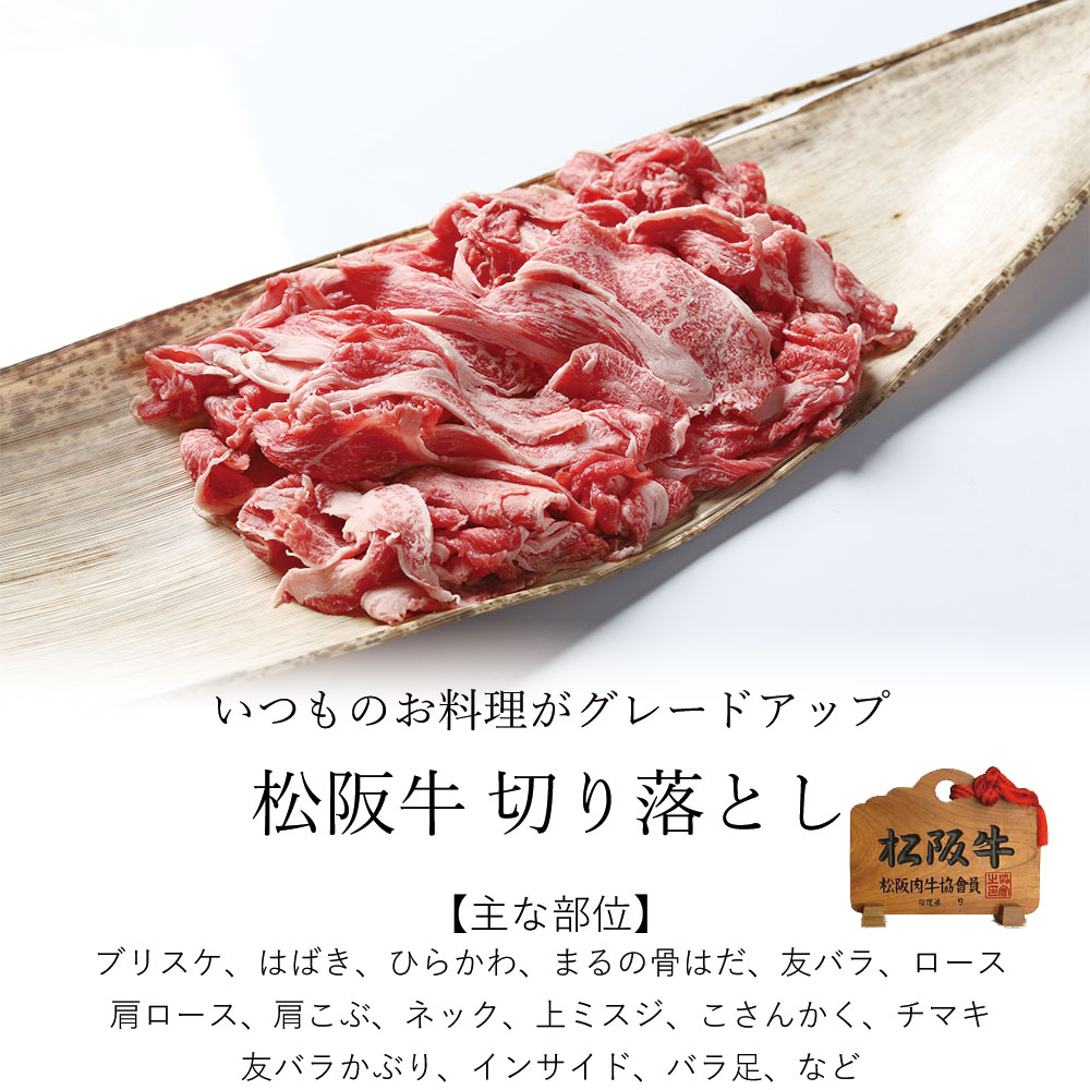 切り落とし肉は、すき焼き肉などをスライスする際に切り出した形の整わない肉のことを言います。小間切れよりも大きく、いろいろな部位のミックスとなっています。松阪牛だけの切り落とし肉ですので、風味や味わい、甘味などは、上級以上の商品と変わりません。さっと炒めて火を通しすぎずにお召し上がりいただくと松阪牛の芳香な香りをご堪能いただけます。松阪牛の香りや甘みを、素材にプラスすると、いつものお料理が驚くほどグレードアップします。